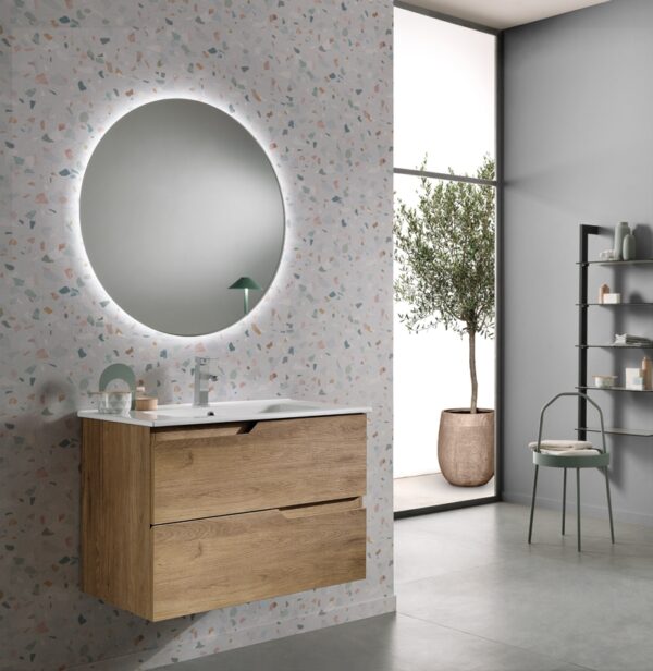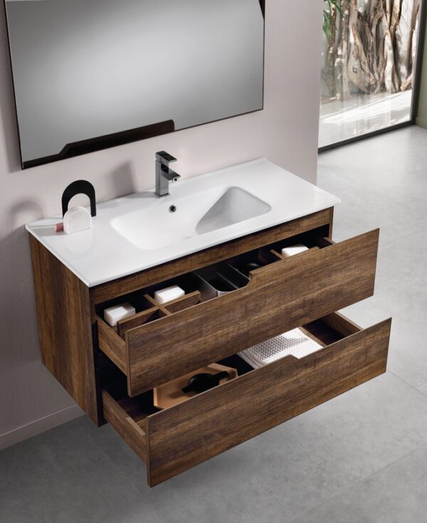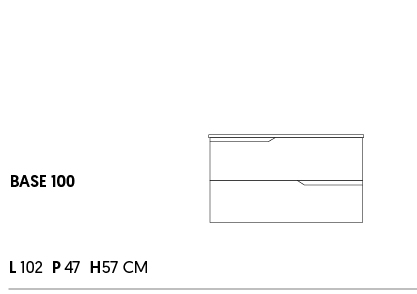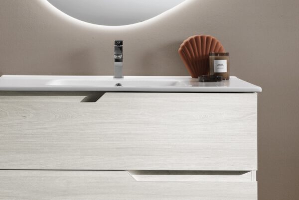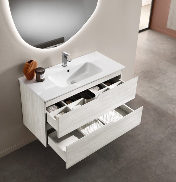 Dati tecnici: base sospesa in mdf laminato melaminico. Cassetti con chiusura rallentata (sistema soft-close). Cassetto superiore con divisori. Lavabo in ceramica dotato del foro troppo pieno.